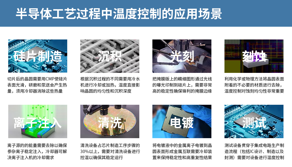 主要應(yīng)用與半導(dǎo)體生產(chǎn)過程中及測(cè)試環(huán)節(jié)的溫度精準(zhǔn)控制40°C以內(nèi),加熱方式采用壓縮機(jī)熱氣加熱