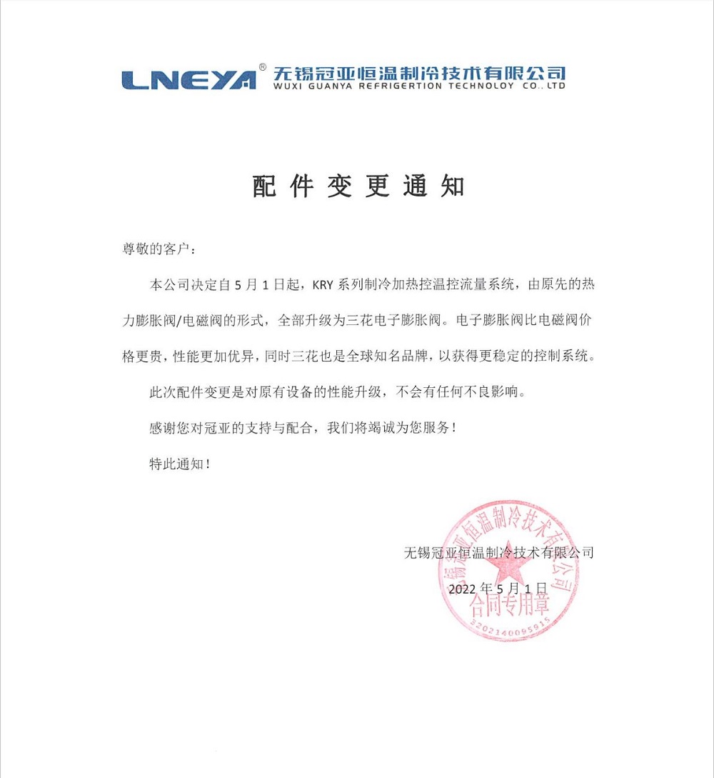 本公司決定自5月1日起, KRY 系列制冷加熱控溫控流量系統,由原先的熱力膨脹閥/電磁閥的形式,全部升級為三花電子膨脹閥。電子膨脹閥比電磁閥價格更貴,性能更加優異,同時三花也是全球品牌,以獲得更穩定的控制系統。