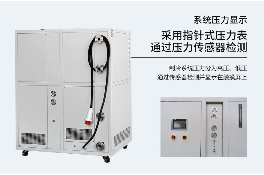 | 系統壓力顯示 | 制冷系統壓力采用指針式壓力表實現(高壓、低壓), 循環系統壓力采用壓力傳感器檢測顯示在觸摸屏上 | |