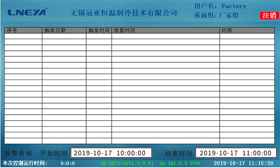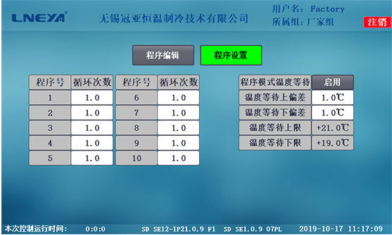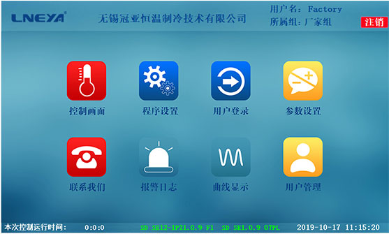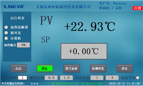 控制畫面,設(shè)置控溫參數(shù),查看實時溫度,同時可以檢測查看制冷機組、加熱器、循環(huán)泵工作狀態(tài),當前的溫度控制模式,解熱排空的狀態(tài)